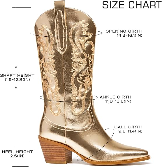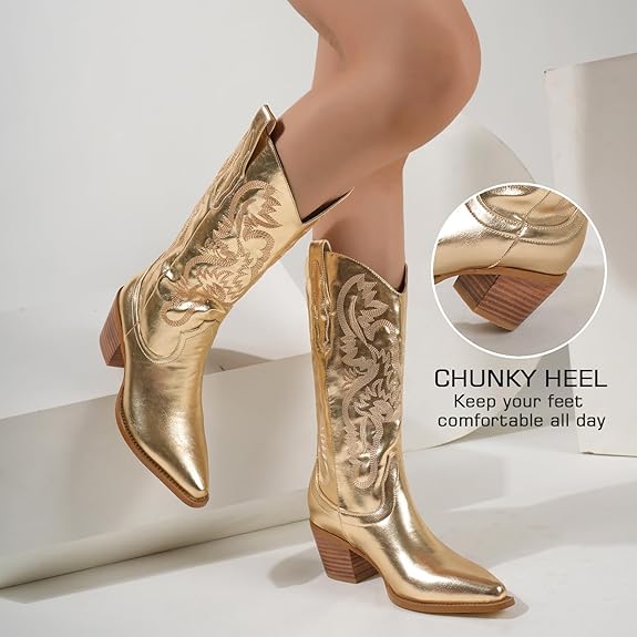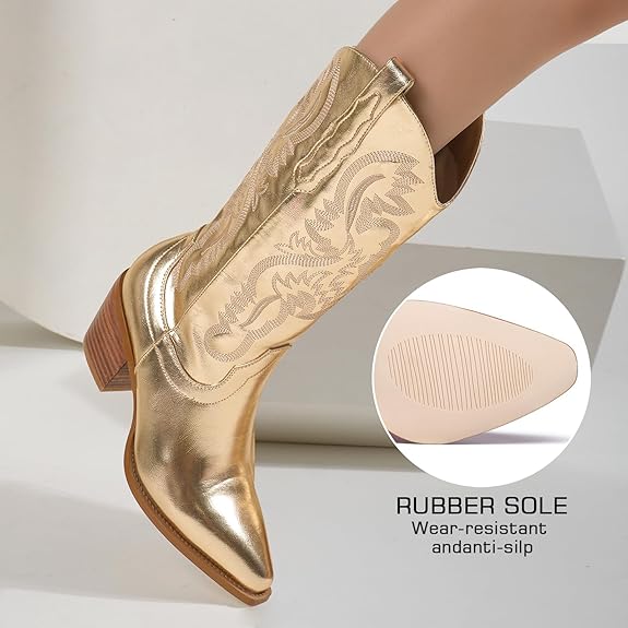 Nos Santiags dorées combinent le luxe du doré avec l’élégance intemporelle du style western. Idéales pour les occasions spéciales ou les sorties nocturnes, elles apportent une touche de sophistication et de modernité à votre garde-robe. Le design robuste et les finitions raffinées garantissent une durabilité et un confort exceptionnels. Que vous les portiez avec une robe élégante ou un jean décontracté, ces bottes métalliques à paillettes sont l’ajout parfait à toute collection de chaussures.