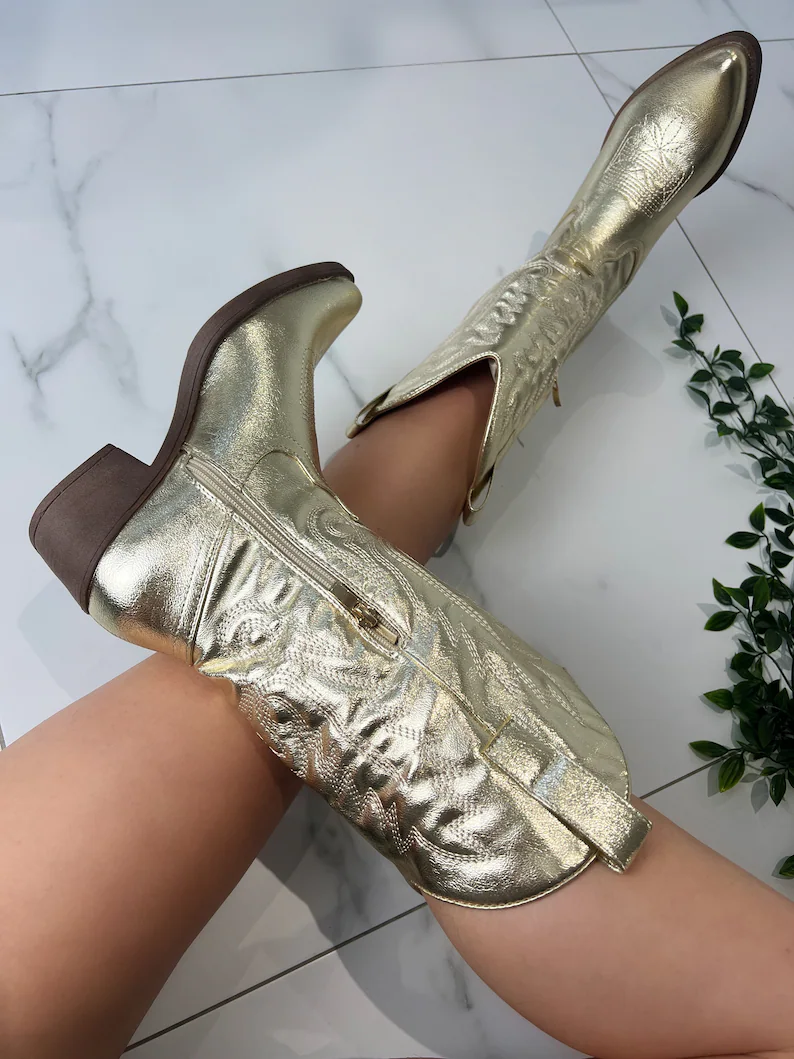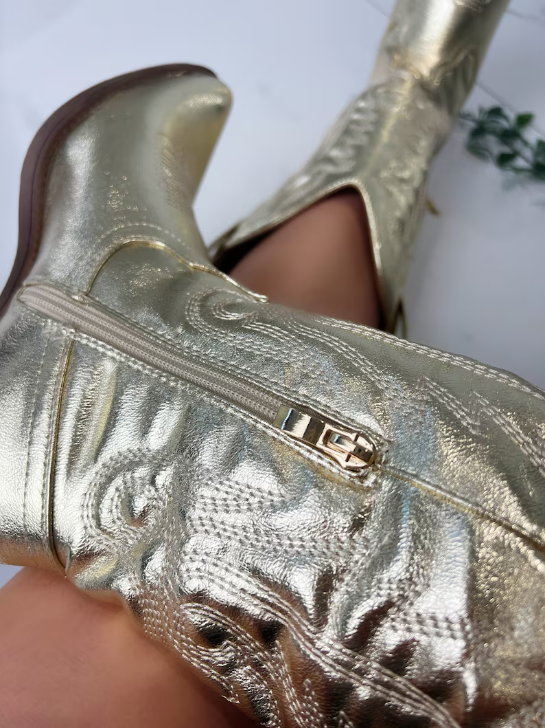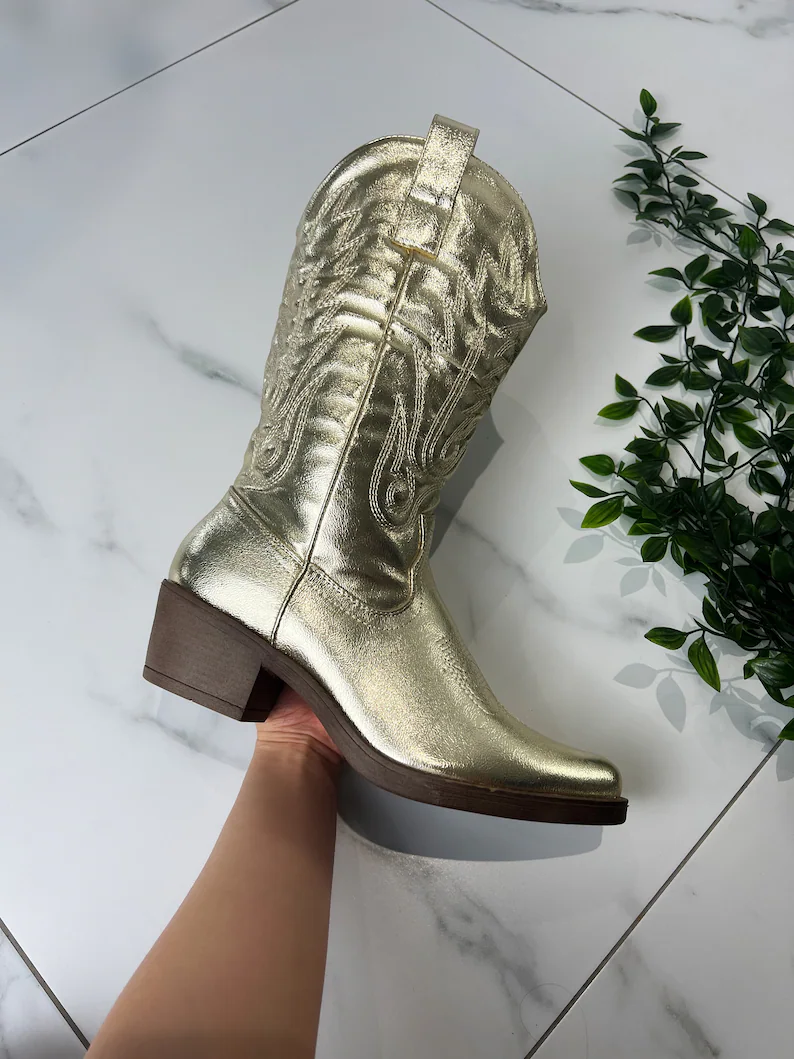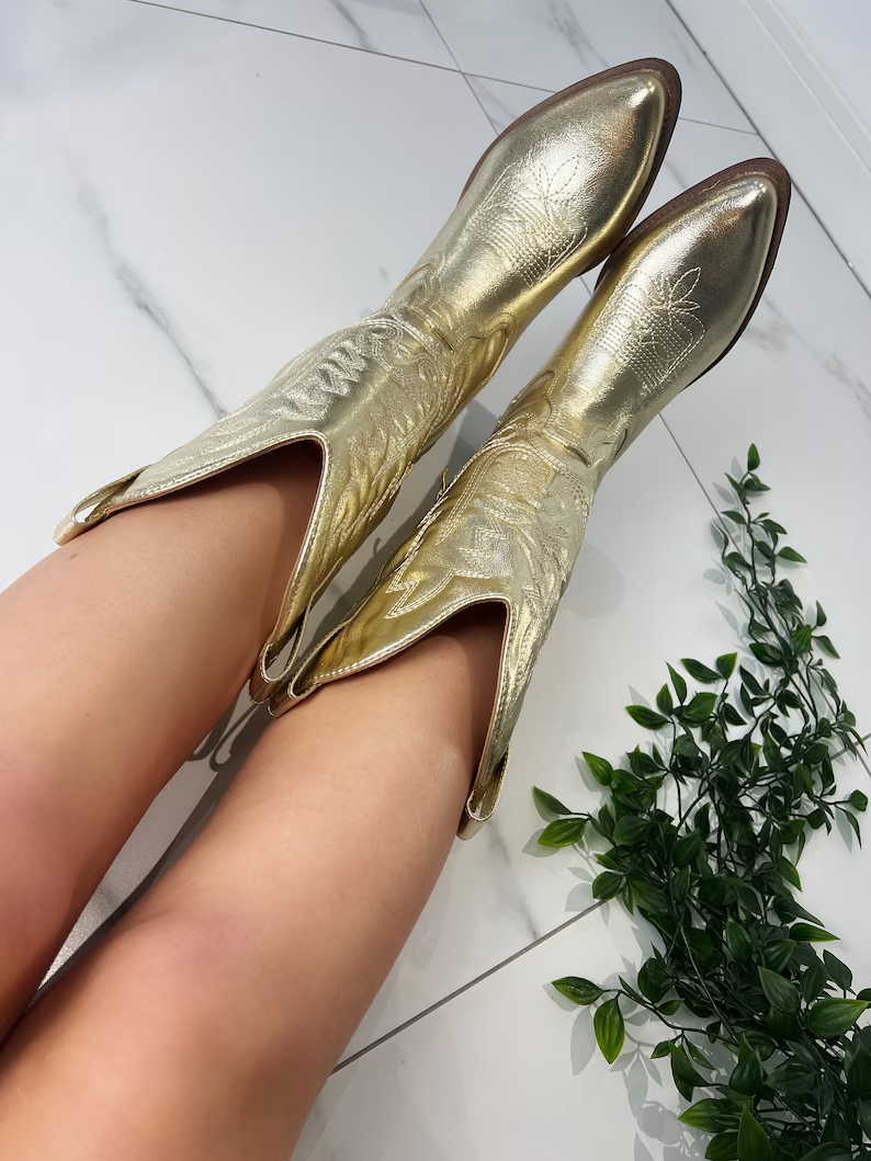 Ces bottes cowboy dorées allient style et confort, parfaites pour toute occasion. Fabriquées à la main avec du cuir végan, elles offrent un look audacieux et sophistiqué tout en étant respectueuses de l’environnement. Promenez-vous avec élégance avec ces bottes de style santiag.