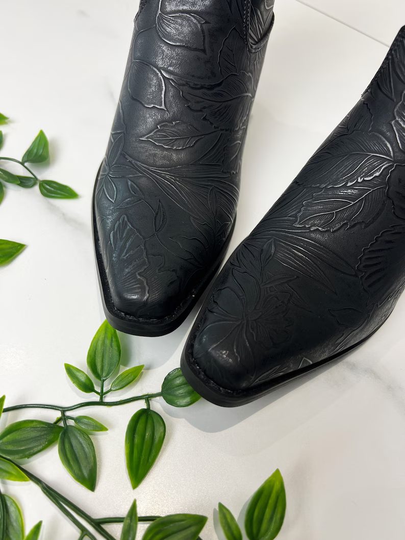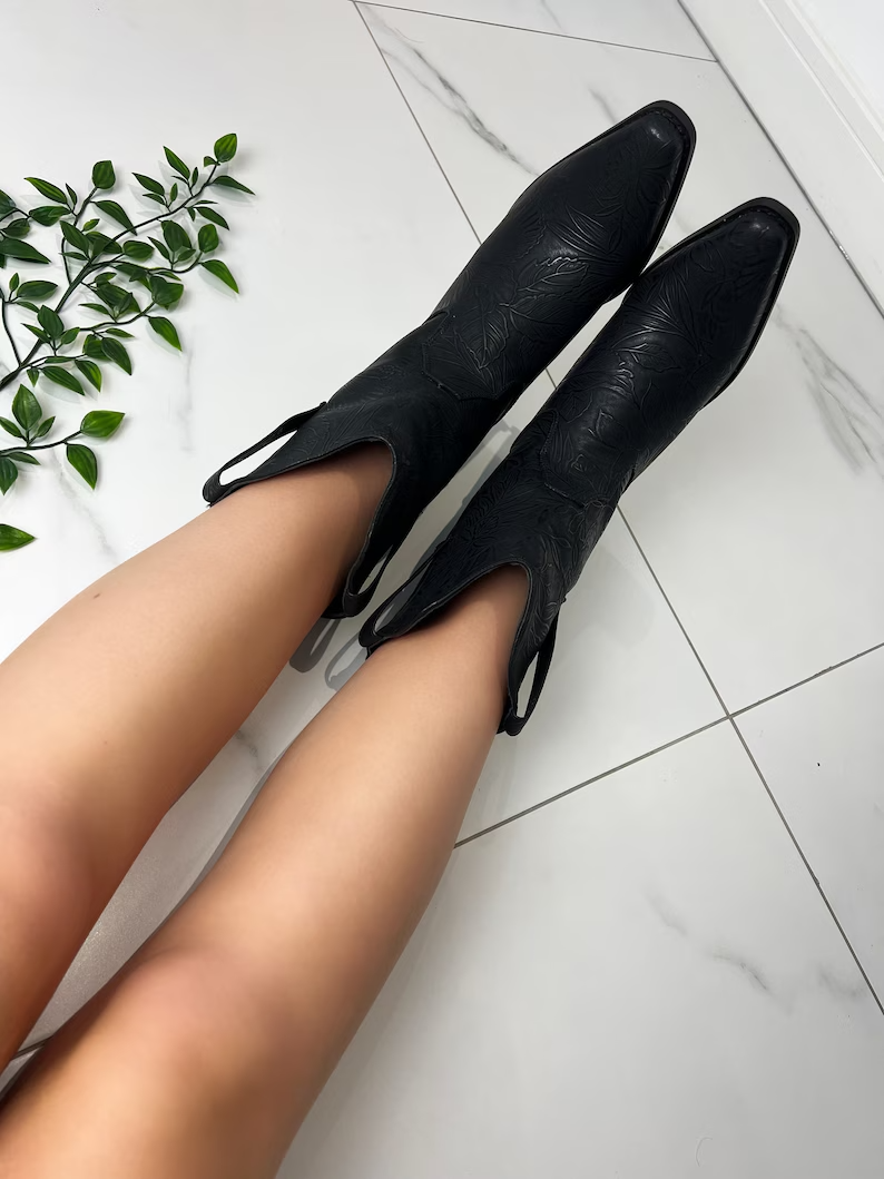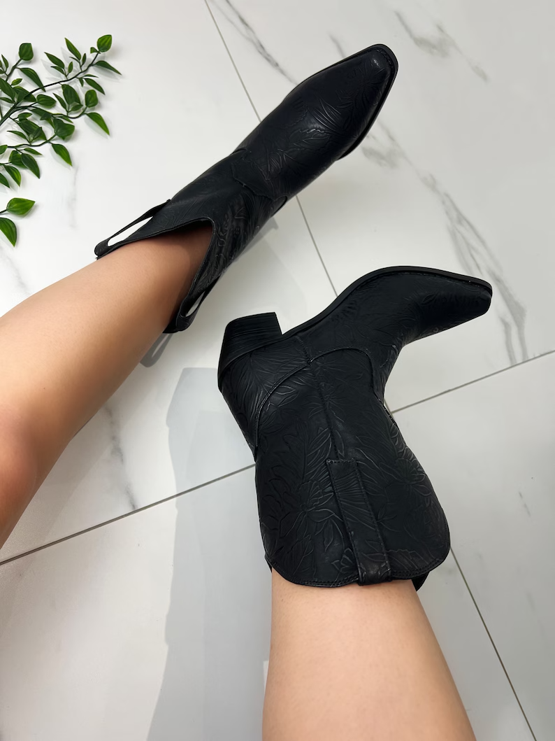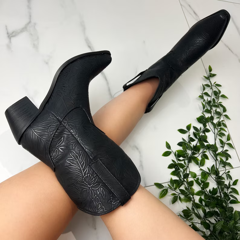 Les bottines cowboy western noires proposées sur Etsy combinent élégance et robustesse pour un look intemporel. Fabriquées avec des matériaux de haute qualité, ces bottines offrent non seulement une allure chic mais aussi une durabilité exceptionnelle. Leur design soigné, avec des détails raffinés, s’associe parfaitement à divers styles vestimentaires, que ce soit pour une sortie décontractée ou une occasion plus formelle. L’intérieur confortable assure un port agréable tout au long de la journée, tandis que la semelle résistante garantit une adhérence optimale sur toutes les surfaces.